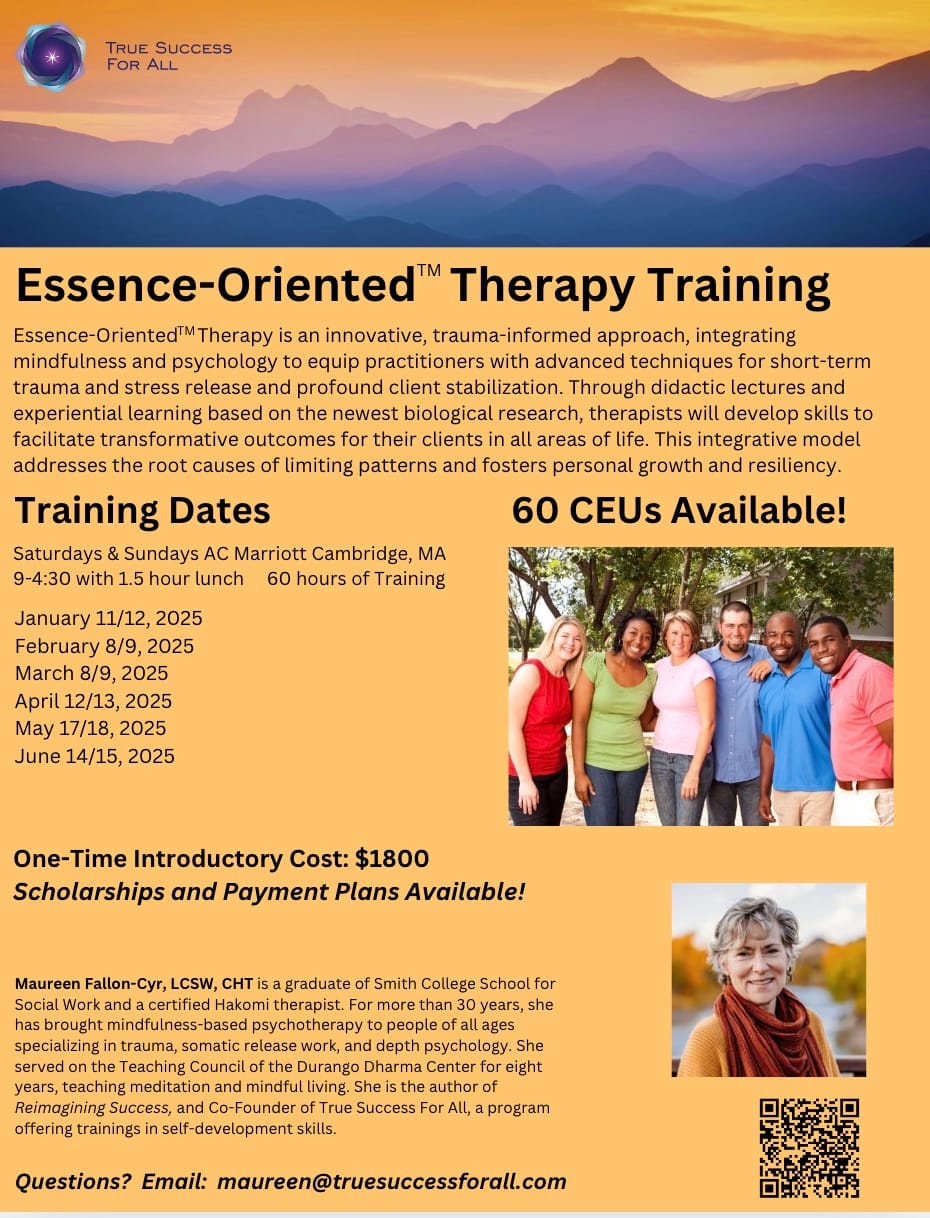 This in-person training meets over 6 weekends, allowing you to deepen your skills and fully integrate the Essence-Oriented model into your life.